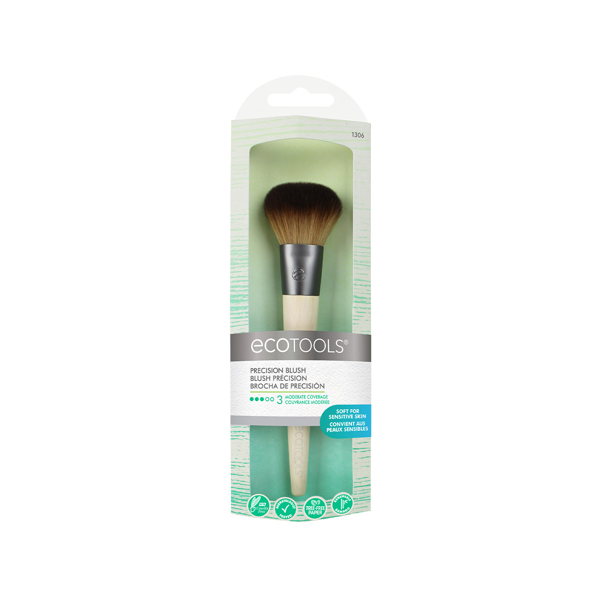 Кисть изготовлена из синтетического ворса – таклона, без использования материалов животного происхождения, основание выполнено из переработанного алюминия, а ручка сделана из натурального бамбука.
