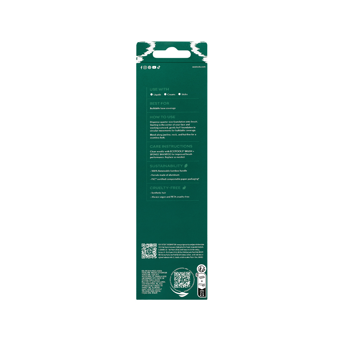 Кисть EcoTools Blending Face Brush с густым плотным ворсом равномерно распределяет тональное средство по коже, обеспечивая стойкое покрытие, от среднего до плотного, без видимых переходов и полос. Подходит для нанесения жидких и кремовых тональных основ, румян и контурирующих средств. Безопасна для чувствительной кожи.