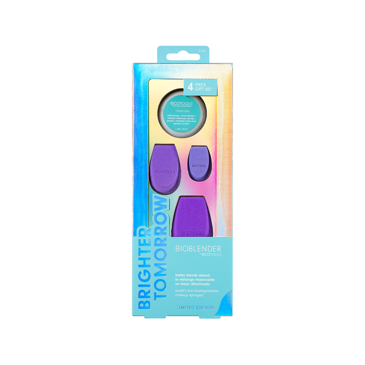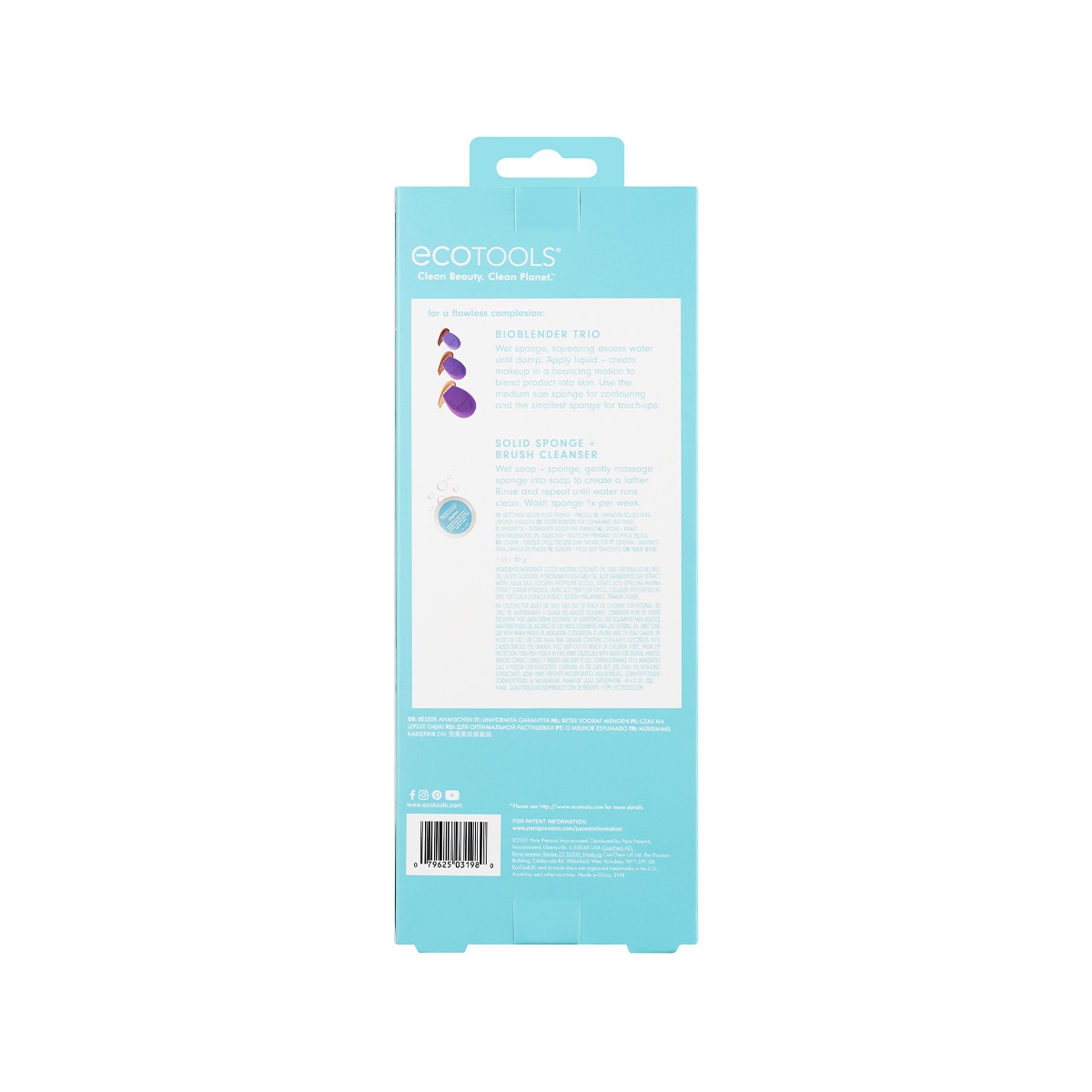 BIOBLENDER by Ecotools – уникальная коллекция спонжей для макияжа, изготовленных из 100% биоразлагаемого материала. В лимитированном наборе EcoTools Bioblender Better Blends Ahead – 3 биоразлагаемых спонжа Bioblender Makeup Sponge для комфортного и удобного нанесения средств на крупные и мелкие участки лица, а также мыло для очищения спонжей и кистей. Большой спонж — для тональной основы, средний — для контуринга, малый — для маскировки несовершенств консилером в зоне под глазами и труднодоступных участках лица. Благодаря специальной форме с тремя поверхностями спонжами удобно наносить и растушевывать продукт. Спонжи идеалены для работы с жидкими и кремовыми средствами. Можно использовать как сухими, так и влажными. Подходит для чувствительной кожи, одобрено дерматологами. Спонж рекомендуется менять каждые 30 дней.