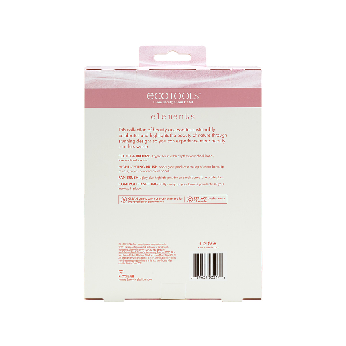 EcoTools Elements — лимитированная коллекция стильных эко-френдли инструментов для макияжа, вдохновленная природными стихиями: огнем, водой, землей и воздухом. С набором кистей для макияжа EcoTools Elements Wind-Kissed Finish Kit, олицетворяющим стихию воздуха, невероятно легко придать лицу свежесть и мягкое естественное свечение, а также деликатно скорректировать черты и пропорции лица. Внутри: