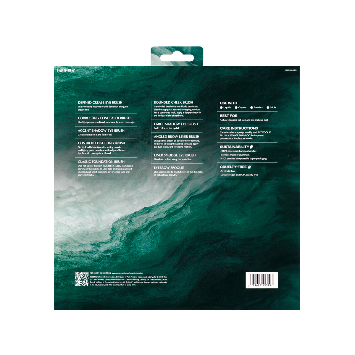 Кисти изготовлены из синтетического ворса – таклона, основания выполнены из переработанного алюминия, а ручки – из натурального бамбука. Продукты EcoTools на 100% веганские и не тестируются на животных, упаковка подлежит переработке.